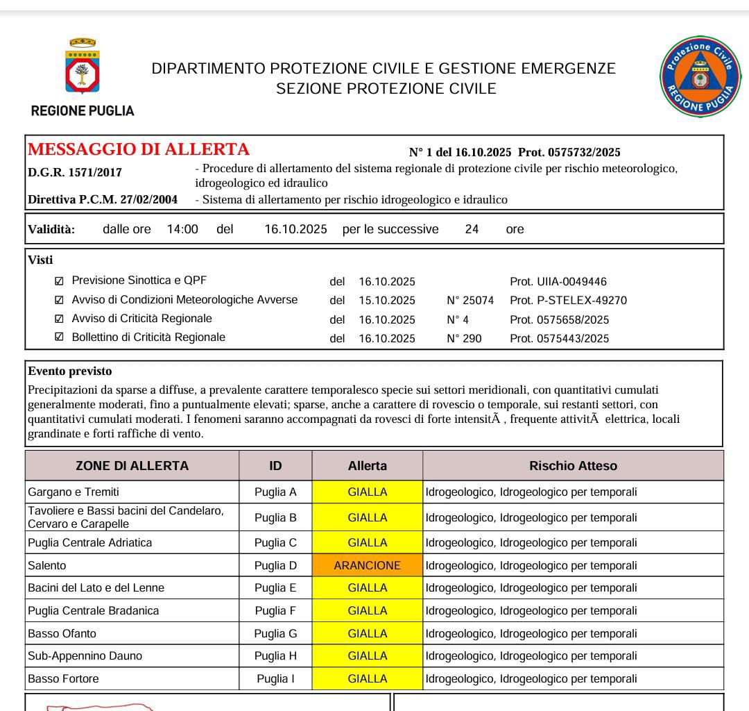 Messaggio di allerta meteo, diramato dalla Regione Puglia, Dipartimento Protezione Civile e Gestione Emergenze - Sezione Protezione Civile, dalle ore 14:00 del 16.10.2025 per le successive 24 ore.